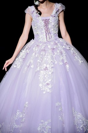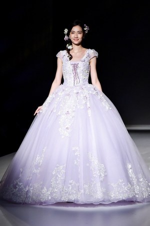 『塔の上のラプンツェル』の主人公・ラプンツェルをイメージしたドレスは全3種。ラプンツェルを象徴する淡いパープルカラーのドレスは、パフスリーブや編み上げ、小花モチーフ、レースといったロマンティックなデザインが細部にまで施され、作品の世界観が随所に感じられる。