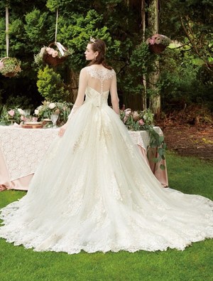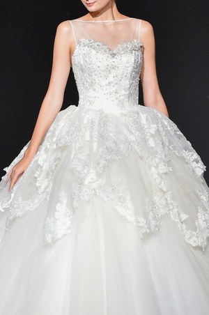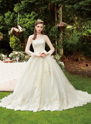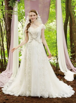 『眠れる森の美女』のオーロラ姫をイメージしたドレスは2種類。中でも、オーロラ姫のドレスの特徴であるシャープな切り替えラインをシルエットに取り入れたドレスは、レース使いと胸元のモチーフが上品で華やかな印象を与える。