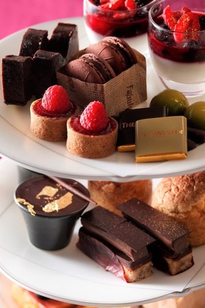 「チョコレートアフタヌーンティー」では、世界中から集められたチョコレートが、アフタヌーンティーに。フランスを代表するチョコレートブランドのカカオバリーにヴァローナ、ベルギーのフリューベルやベルコラーデなど、選りすぐられた逸品たちを一度に堪能できる。