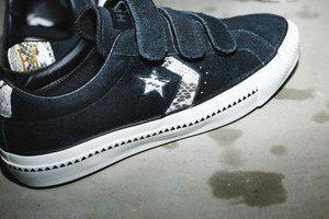 コラボレーションシューズは、 3本のベルクロを採用した着脱しやすい「オールスター V-3」をベースに制作。アッパーの素材には、耐久性に優れたブラックスウェードを採用し、シェブロン&スターのアイコニックなモチーフにスネーク柄を配した。
