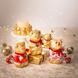 幼いころの幸せな記憶の象徴であるテディベアを高品質なミルクチョコレートで象った「リンツテディ」は、リンツのクリスマスのシンボル。ゴールドのホイルに赤いリボン、ハートのチャームで飾った、愛らしい仕上がりが魅力だ。