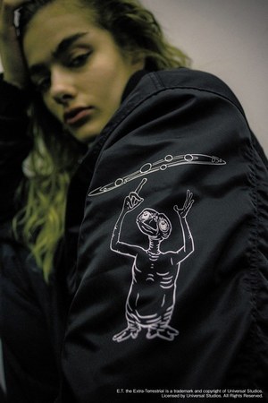「マウジースタジオウェア」と『E.T.』とのコラボレーションは、2018年4月に次ぐ2度目。今回用意されたボンバージャケットは、袖口をファスナーで着脱できる上、リバーシブル仕様となっており、いくつもの着こなしを楽しむことができる。
