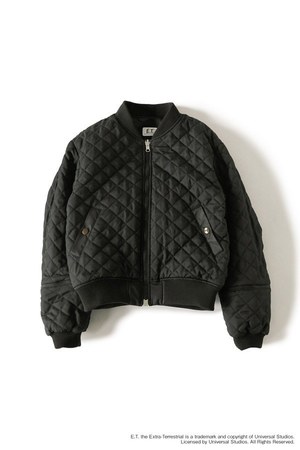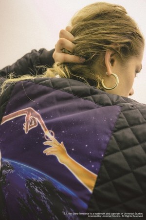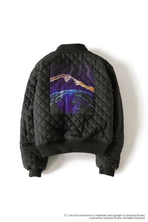 光沢感のある表側には、左胸と後ろ身頃上部にロゴを配し、左袖に手書き風の『E.T.』をプリント。キルティング仕様になっている裏側のバックスタイルには、人差し指を合わせるあの名シーンが、転写プリントで施されている。