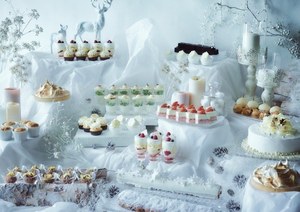 コンラッド東京の「ラグジュアリー・ウィンターリゾート・スイーツビュッフェ」では、ウィンターリゾートとして名高いサン・モリッツから見える、スイスアルプスやサンモリッツ湖の美しい風景から着想を得たスイーツやセイボリーを揃える。白を基調としたスイーツは、ストロベリーホワイトショートケーキや、コーヒー風味のホワイトロールケーキなどクリームやホワイトチョコの優しい味わいを楽しめる。