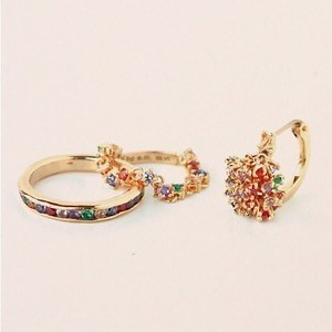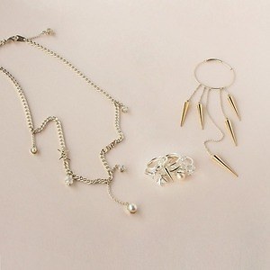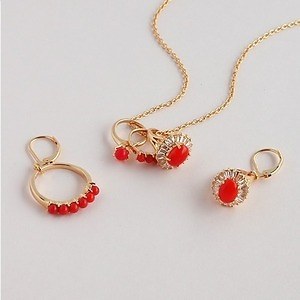 ビューティフルピープルとのコラボレーションジュエリーは、カラフルなストーンをあしらったピアスやリングなどを用意。シアタープロダクツからは、レッドのストーンが華やかな印象を演出する、ネックレスやピアスが展開され、ミハラ ヤスヒロからはスタッズモチーフのピアスなどが登場する。