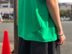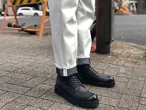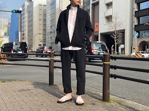 セットアップは、ミッドウエストもおすすめの1ルック。バリッとしたハリ感のある素材で、ジャケットはやや膨らむような立体的なバックシルエットと、フロントに施したプリーツが魅力。パンツはロールアップすれば、裏地のブラックがアクセントとなる。