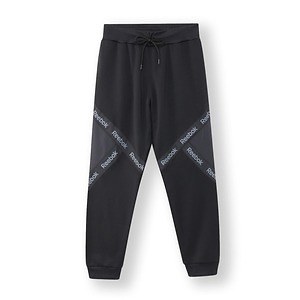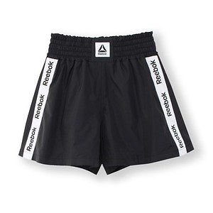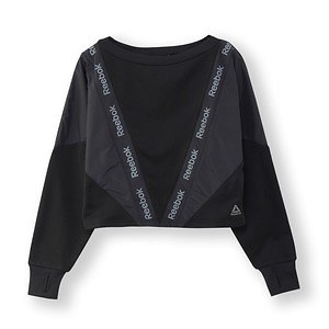 ブラックをベースに短めの丈にアレンジしたトップスは、リーボックのネーム入りテープを配したデザイン。同色のパンツと合わせて、セットアップでの着用も可能だ。