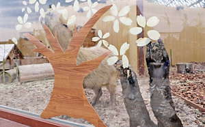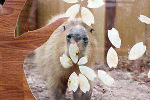 水辺と森にくらす生きものを展示するエリア「フォレストリウム」に暮らすカピバラとカワウソ。彼らが同居する展示室のアクリルガラスには、大きな桜の木を演出。また、桜の花びらの形にカットしたリンゴをもぐもぐ食べる可愛らしい姿も鑑賞できる。