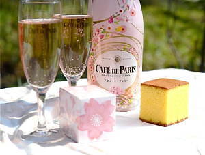 「カフェ・ド・パリ」×カステラの老舗「福砂屋」ポップアップ・バーでは、桜をテーマにスパークリングワインとカステラを楽しめるメニューを展開。チェリーフレーバーのスパークリングワイン「カフェ・ド・パリ カラフルパーティー スウィート・チェリー」と、桜パッケージの限定品カステラ「フクサヤキューブ」をセットに。桜チョコフレークを添えて提供する。