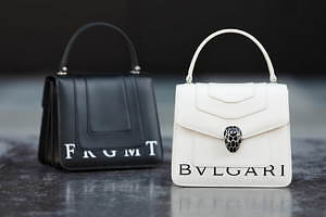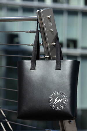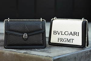クロスボディバッグや、ダイヤモンド ブラストといったバッグには、「BVLGARI」の文字と、藤原ヒロシ手掛けるフラグメントのロゴ「FRGMT」を合わせた。また、蛇モチーフのクロージャーには、フラグメントの稲妻ロゴを配している。