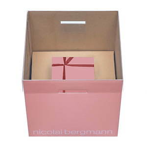 温かみのあるピンク色のフラワーボックスには、ウィスキーブラウンの刻印を施し、角度によって様々な輝きを楽しめる仕様に。箱の中には、サーモンピンクのカーネーションや花が詰め合わせられている。アクセントにライトグリーンの花を組み合わせ、明るく爽やかな印象に仕上げている。