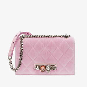 アレキサンダー・マックイーン(Alexander McQueen)は、スワロフスキークリスタルやスカルモチーフの4つのリング“フォーリング”を配したチェーンショルダーバッグ「ジュエルド サッチェル」の新作として、キルティングベルベットのモデルを発売。イングリッシュローズや煌びやかな舞踏会をイメージしている。