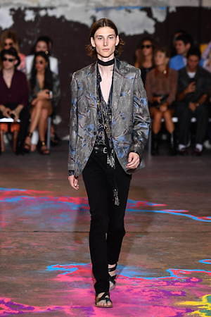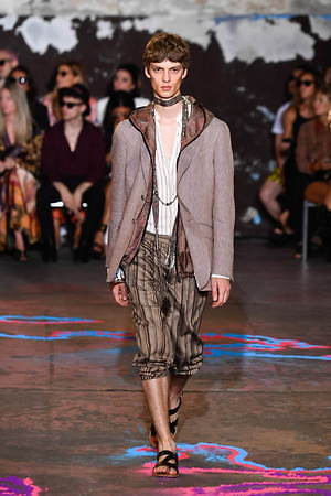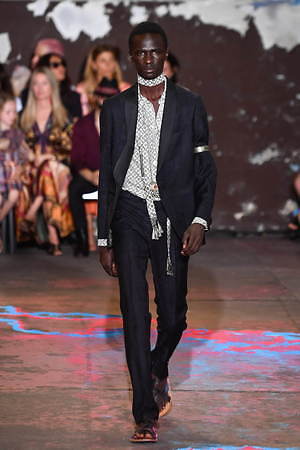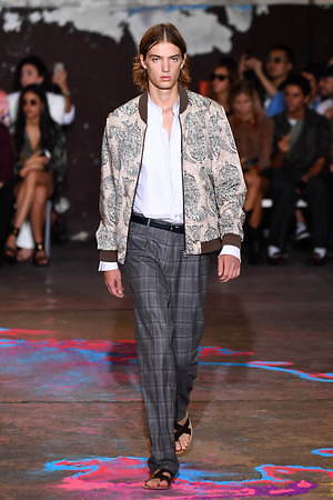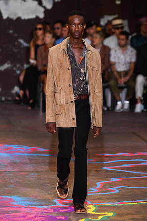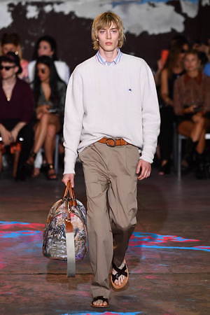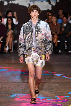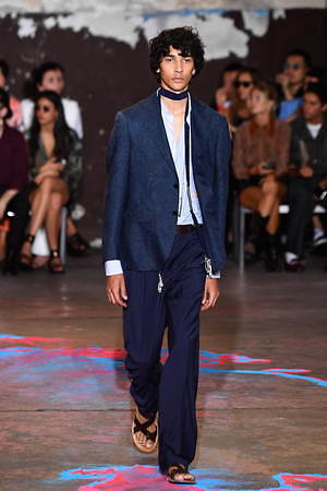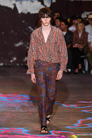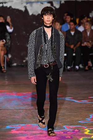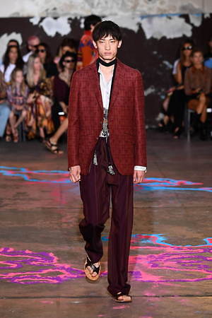 ボヘミアン柄の真っ赤なジャケットや、花のエンブロイダリーを施したフォークロア調のベストを合わせたルックも登場。彼らの着こなしは共通してリラックスしたムードが流れていて、パンツの裾をロールアップしてみたり、首元を締め付けないようにシャツのボタンをいくつか外していたりする。また足元は決まって素足×サンダルという夏らしいスタイルだ。