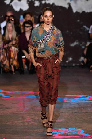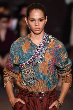 フォークロアな要素を孕んだアイテムと並んで登場したのは、ブランドを象徴するペイズリー模様のプルオーバーやジャケット。また今季は、カラフルなジオメトリックもふんだんに取り入れられているのが特徴だ。マスタード色のロングコートには、パープルで彩られたジオメトリック柄のライナーを組み合わせ。裾が翻るたびに現れるその鮮やかなコントラストは、はっと目を惹くほどの美しさだ。