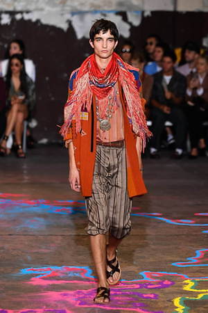 今季のエトロは、ジャケットやパンツスタイルをカジュアルに楽しむイタリアンファッションを、フォークロアな要素で再解釈。ファーストルックを飾ったのは、白シャツ×スラックスにポンチョを被った着こなし。メンズモデルの首には、ネクタイの代わりにネイティブアメリカンのお守りをモチーフにしたかのようなネックレスやフリンジ付きの長いテープが巻き付けられている。