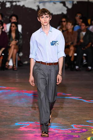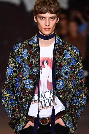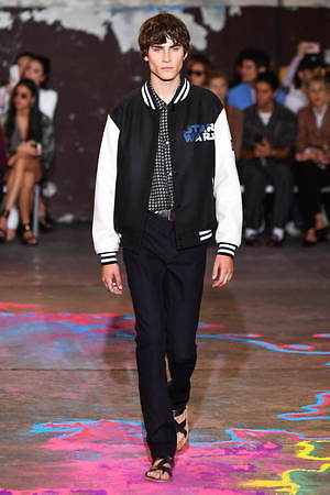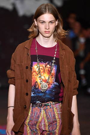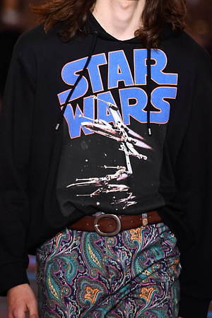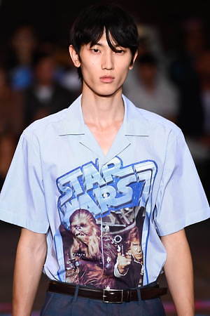 ショーの終盤に登場したのは、映画『スター・ウォーズ』をモチーフにしたアイテムの数々。パンツにタックインした爽やかなYシャツには、チューバッカやハン・ソロといった人気キャラクターを配したデザインをはじめ、『スター・ウォーズ』ロゴを胸元のポイントにいれたものも。ちょっとしたユーモアと捻りで、イタリアンファッションはもっとワクワクに満ちたものになる。そんなウィットに富んだデザイナーの遊び心が感じられるコレクションとなった。