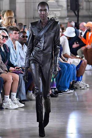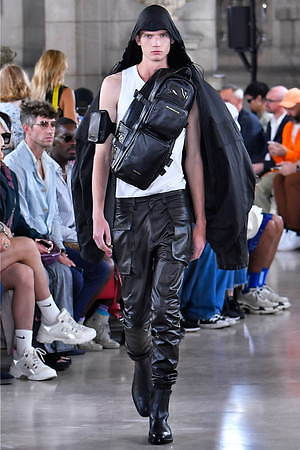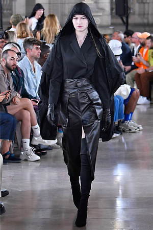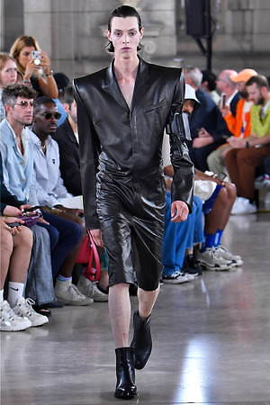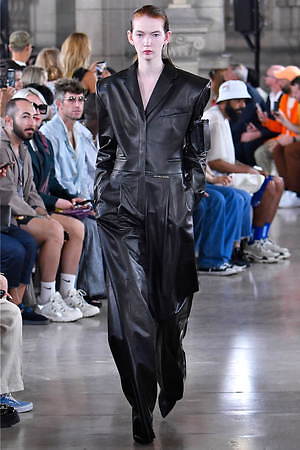 ファーストルックから登場したレザー仕立てのカバーオールは、ジャケット×パンツのスーツスタイルをドッキングさせたようなデザイン。スーツジャケットにあたるそのショルダーは大幅に拡張されていて、ツンと天を向くシャープなフォルムが特徴。ボトムス部分は、実際にジャケットと組み合わせるパンツデザインと連動しているようで、ワイドパンツ、細身のスラックス、細身のハーフパンツ…と、表情を変えていく。
