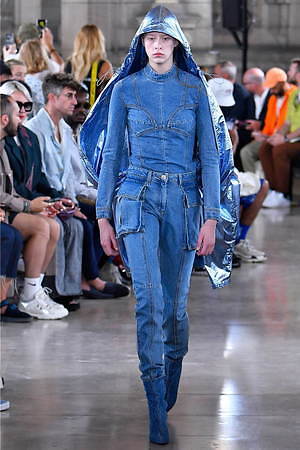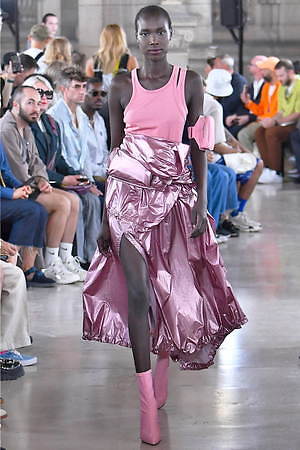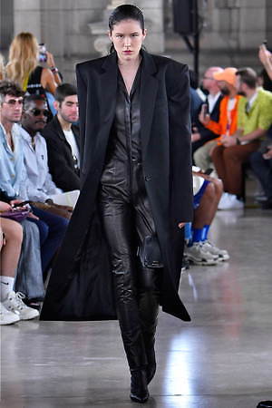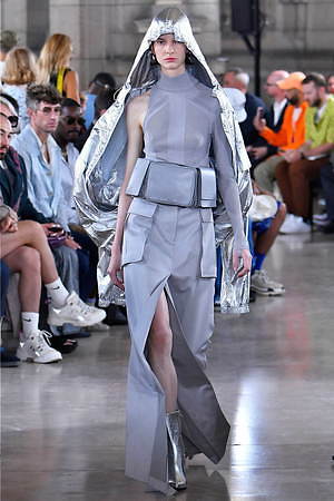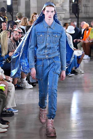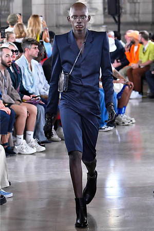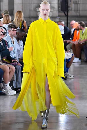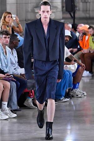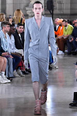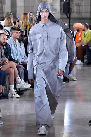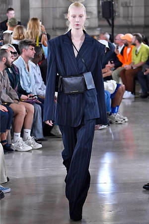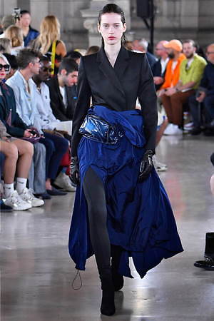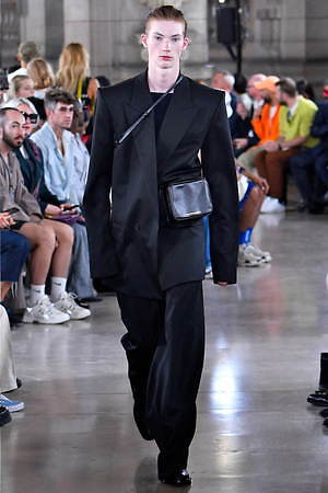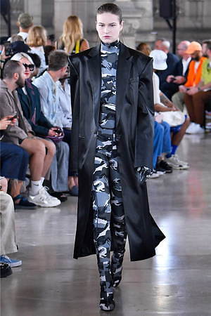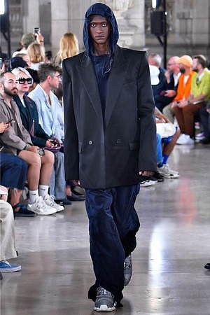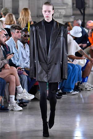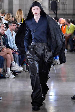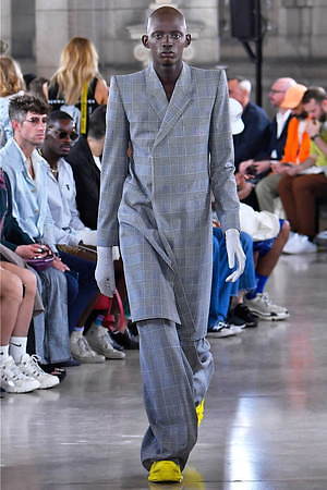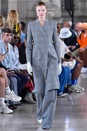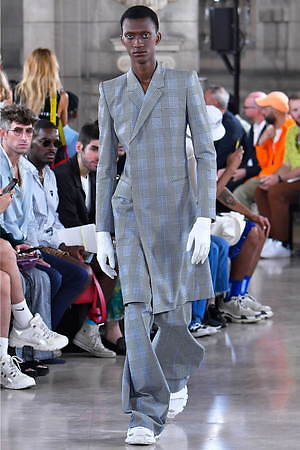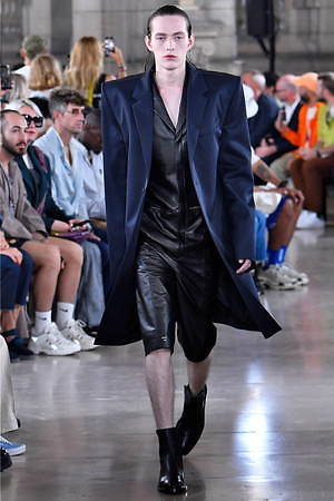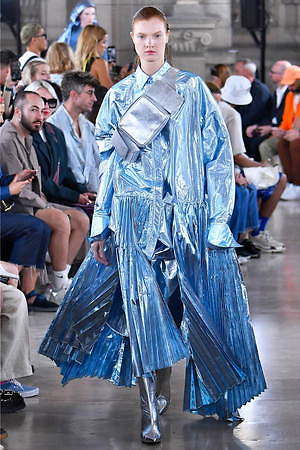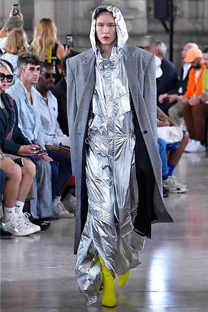 そんな“フェイク”フォーマルウェアに、実際のスーツジャケットとレイヤードしたルックも登場。けれど相変わらずその肥大化したショルダ―はそのままで、その裾は足の長いモデルの膝下まで伸びているという具合だ。