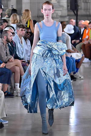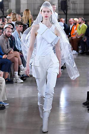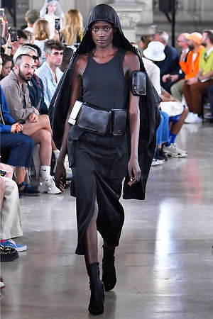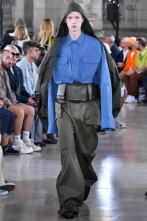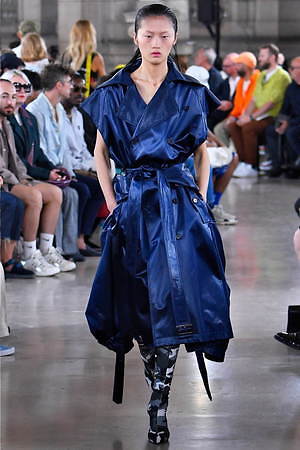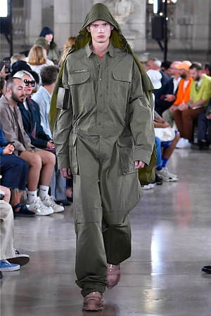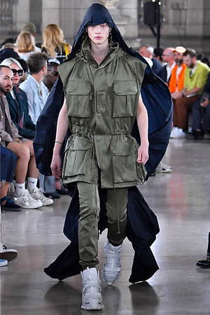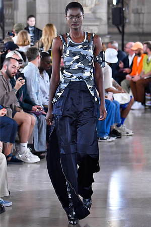 やがてそれらのワードローブには、ミリタリーとスポーティーな要素とも融合されていく。フラップポケットを巨大化させたミリタリー風ベストには、ボリューミーなジップ付きジャケットをスタイリング。ジップの開閉によってスカートのようなフォルムに変形するミリタリーパンツには、スポーティーなカモ柄のタンクトップを組み合わせている。やはり1つ1つの洋服には、本来のユニフォームの要素からはどこか外れていて、デザイナーの斬新な視点1つで洋服は“何にも属さない”ジャンルへとカテゴライズされていく可能性があることに気付かされる。