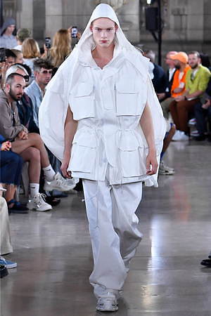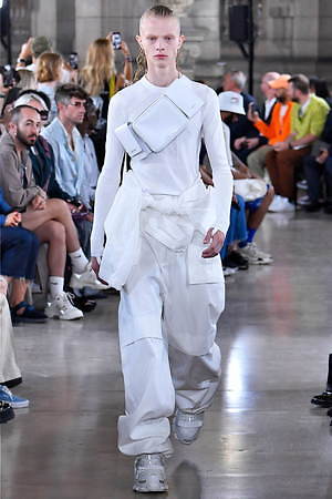 全ての色を“抜いてしまった”ワードローブがその好例。ミリタリーやスポーティーな要素を引き継ぎながらも、他のアイテムと配列していなければ、もとは何をベースにしていたのかを想像することは決して容易ではない。ブランドの目指す“新しいデザイン”の創造とは、従来の固定観念にとらわれないウィットなアイディアの積み重ねから生まれていくのだろう。