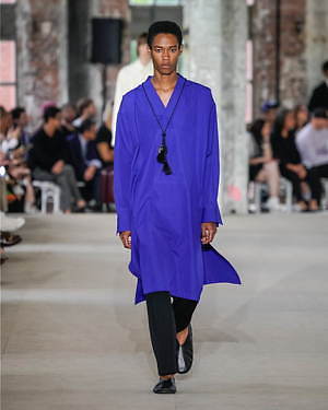 また、ノッチドラペルのウールジャケットは、オーセンティックに着用したルックも登場する一方で、ラペルを内側に折り畳んだ斬新な着方も提示。また、和装の襟を思わせるクリーンなVネックシャツやロングシャツは、首元をすっきりと見せ、開放感を演出する。