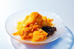 表参道ヒルズ内に店舗を構える中華の名店「蔭山樓」が提案するのは、マンゴー味の染み込んだふわふわ食感のかき氷をベースに、マンゴー果肉をふんだんにトッピングした一品。仕上げにモチモチのブラックタピオカとマンゴープリンをトッピングした、贅沢な台湾風かき氷となっている。