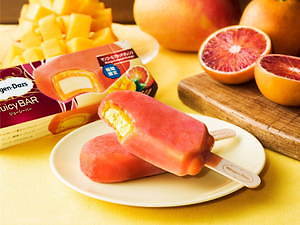 ハーゲンダッツ(Häagen-Dazs)のジューシーバー「マンゴー&ブラッドオレンジ」は、香り高くトロピカルな味わいのアルフォンソマンゴーを使ったマンゴーアイスクリーム。やわらかな食感のマンゴー果肉と、色鮮やかで酸味のあるブラッドオレンジ果汁の2層でコーティングしている。