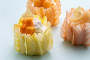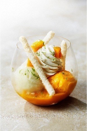 ザ・リッツ・カールトン京都に登場する、ピエール・エルメ・パリ(PIERRE HERMÉ PARIS)のパフェデザート「クープ グラッセ」の“エキゾチック”は、マンゴーが主役のフレーバー。芳醇な味わいのマンゴーソルベやライムアイス、マンゴーソース、マンゴー、シャンティクリームを合わせ、ココナッツのマカロンを飾った。