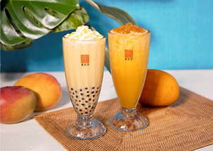 春水堂(チュンスイタン)の「タピオカマンゴーミルクティー」は、毎年夏にだけ登場する人気の限定ドリンク。ほんのり酸味のきいた濃厚なマンゴーを贅沢に使い、さわやかな香りのジャスミンティーとミルクにブレンドしている。仕上げには、たっぷりのクリームとマンゴーソースを飾った。