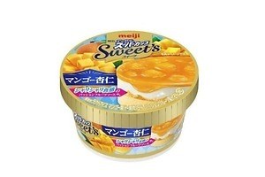 「明治 エッセルスーパーカップ Sweet's マンゴー杏仁」では、マンゴー味と杏仁豆腐風味の2種のアイスの間に、かき氷のように“シャリシャリ”とした食感が楽しめるパッションフルーツソースをサンド。仕上げには果肉入りのジューシーなマンゴーソースをたっぷりとかけて、爽やかな酸味をプラスしている。