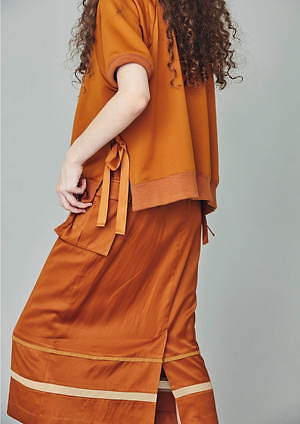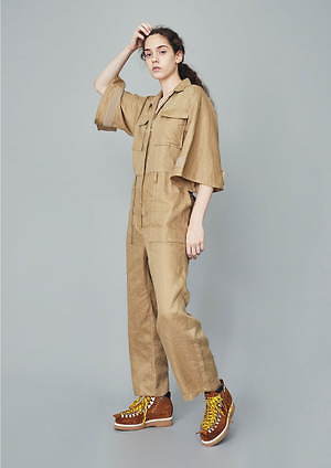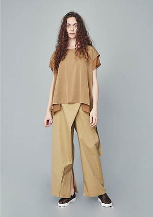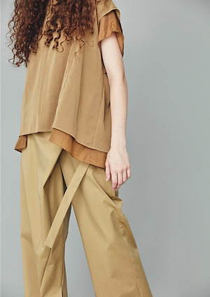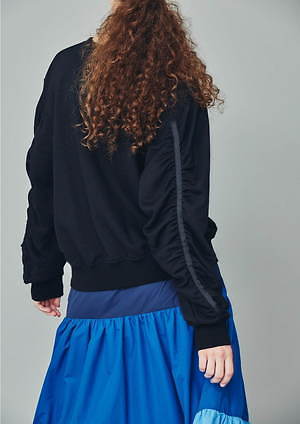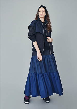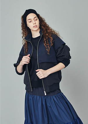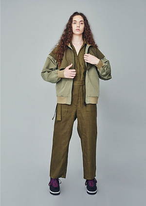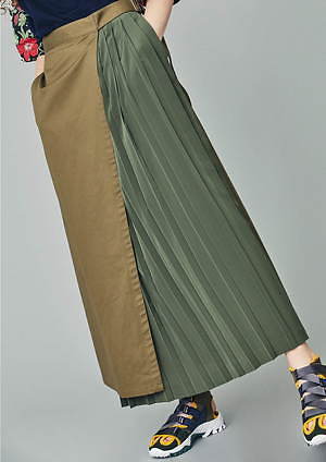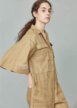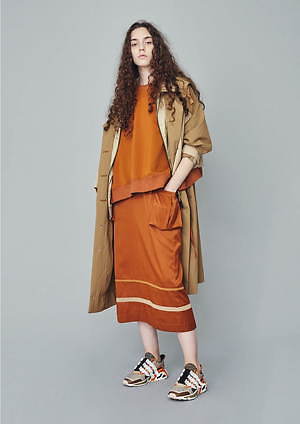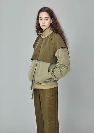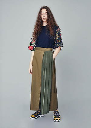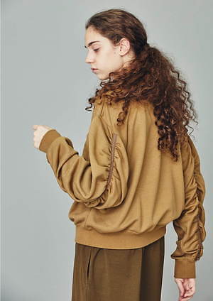 時にはミリタリーなムードも香らせて。ブラウンのスウェットシャツは、後部のアームのみギャザーを施して、MA-1のような独特なデザインを表現。また光沢感のあるプリーツと組み合わせたラップスカートや、ヨーク部分と袖のレイヤードで構築的なシルエットに仕上げたジャケットは、ミリタリーライクなカーキ色が多用されている。