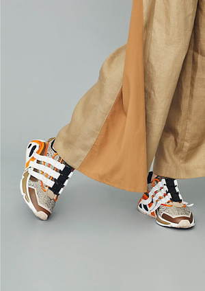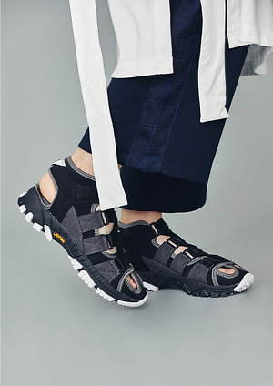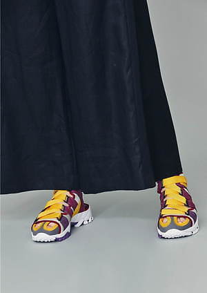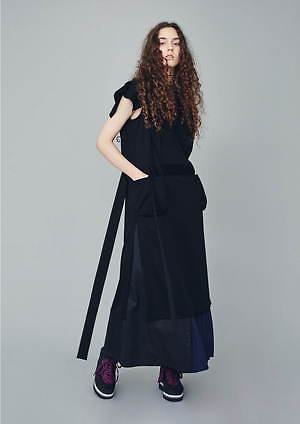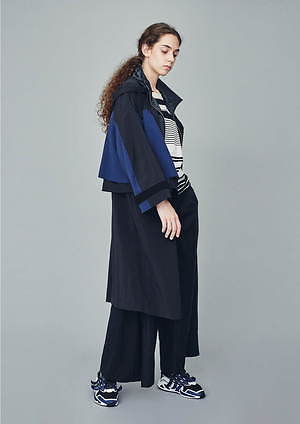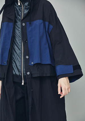 今季デザイナーの相澤陽介は、レイルランニングやスカイダイビングといった、エクストリームスポーツに着想を得た。それらのスポーツで使用される“身体を守る”ためのコードが、パンクファッションやアンチテーゼの表現と重複して見えたことから、メンズ同様“COINCIDENCE”=「偶然の一致」をテーマに、様々な事象を重ね合わせたワードローブを展開していく。