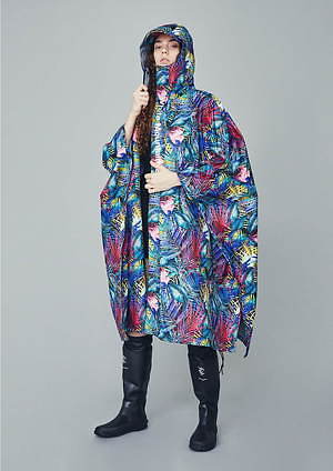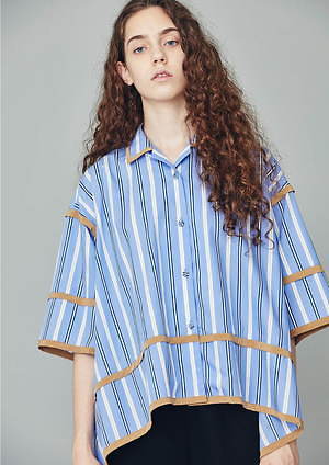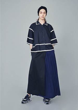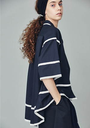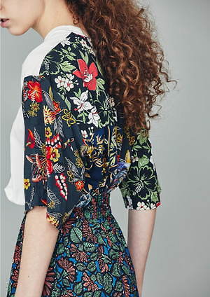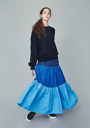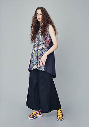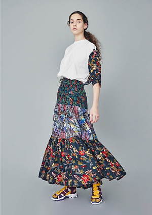 コレクションの中でひと際存在感を放っていたアロハ調の花柄のテキスタイルは、メンズコレクションでも展開されていたもの。ロング丈のティアードスカートには、オリジナルのボタニカル生地を組み合わせて、アイキャッチな一着に仕上げていた。