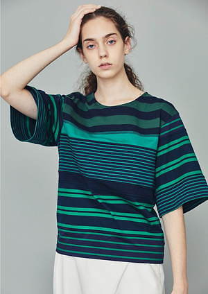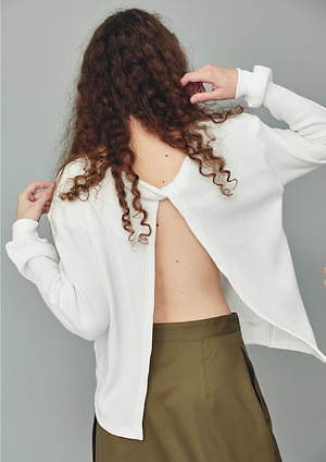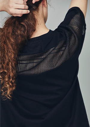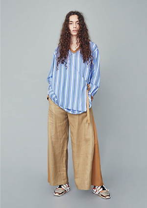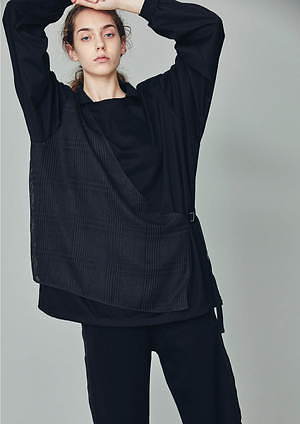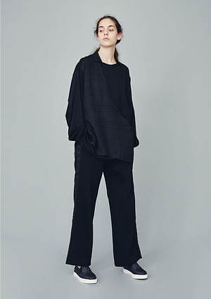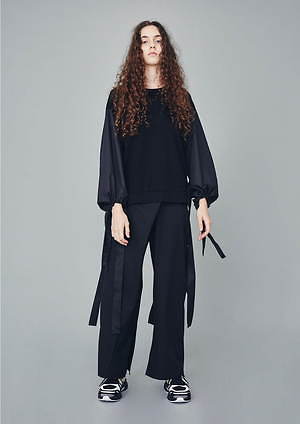 また単調なパレットの中でも、女性らしさをさり気なく表現しているのが、素材のドッキングである。本来ラフなスウェット生地のホワイトのチュニックには、艶めくシャツ地のパフスリーブを組み合わせて、フェミニンなムードをプラス。またリネン100%のツイル生地で仕立てたブラックのマニッシュなワイドパンツには、なめらかなドレープを描くレーヨンをサイドに差し込んだことで、ミニマルなスタイリングでもエレガントに着こなすことができる。