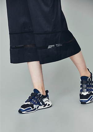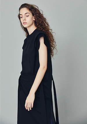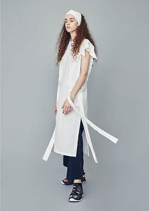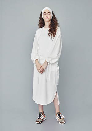 ノイジーな柄の目立つメンズとは一変、今季のウィメンズウェアは余分なモノを排除したミニマルな表情が印象的。ホワイト、ベージュ、ネイビーなどベーシックなカラーパレットを基軸に、モノトーンや同系色で揃えたスタイリングが目立つ。そんな着こなしのアクセントとなっているのが、今季デザイナーが目を付けた“コード”。洋服の裾やサイドからヒラリと揺れるそれらのコードは、シンプルな洋服に躍動感をもたらし、アクティブな印象を添えてくれる。