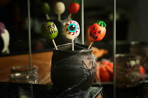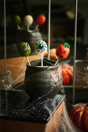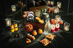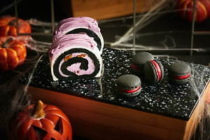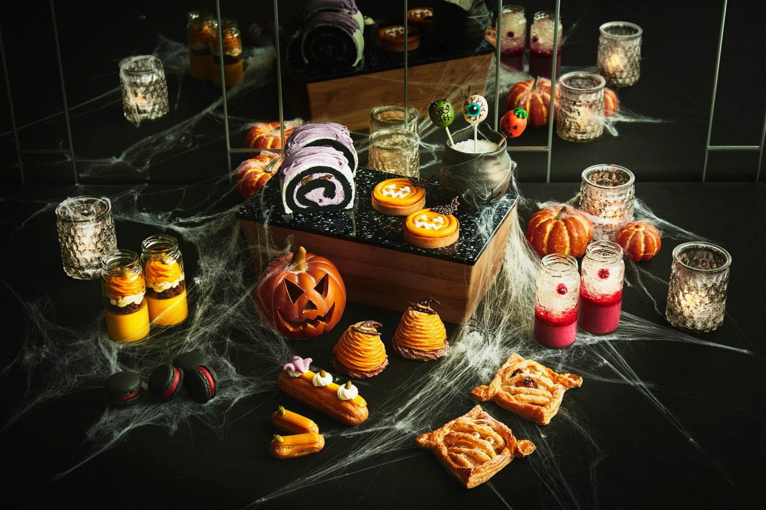 また、1階のペストリー ショップでは、ハロウィンをイメージしたコワ可愛いスイーツがラインナップ。パンプキンエクレアやロリポップなど、不動の人気アイテムに、竹炭の生地で紫いものシャンティと栗を巻いたロールケーキなどの新作も追加。旬の食材をユニークな見た目で表現したハロウィンならではのスイーツとなっている。