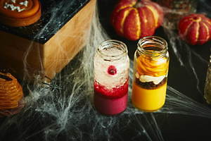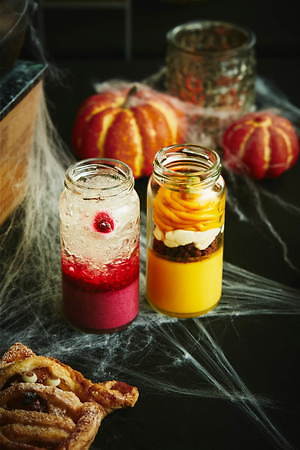アンダーズ 東京のメインダイニング「ザ タヴァン グリル&ラウンジ」で開催されるハロウィン アフタヌーンティーでは、ストロベリークリームチーズを巻いた表情豊かなおばけのサンドイッチや不気味な目玉のジュレが浮かんだカシスとレモンの甘酸っぱいヴェリーヌ、コウモリの止まったかぼちゃのタルトなど、楽しい見た目のメニューを多数用意する。