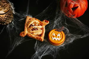 (お墓)キャロットムース ブラックオリーブパウダー コーンビーフ、(ミイラ)鶉の卵 グアカモレ 黒マヨネーズ ライ麦の黒パン、(かぼちゃのランタン)プロフィトロール セイボリーパンプキンピューレ、(おばけ)ストロベリークリームチーズ ホワイトブレッド、(クモの巣)キッシュタルト スイートポテト ラムエッセンス マヨネーズ