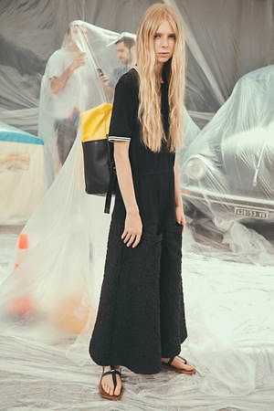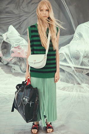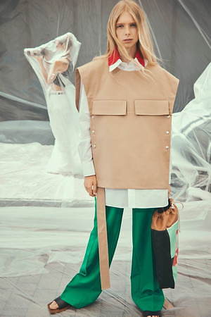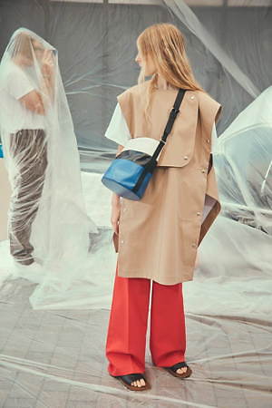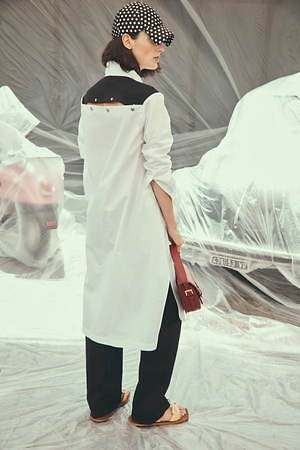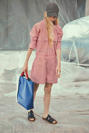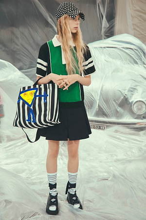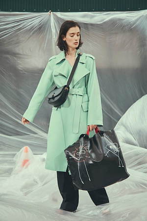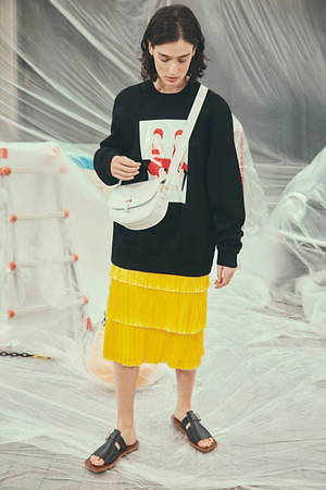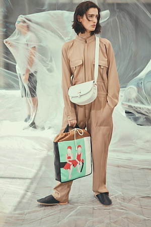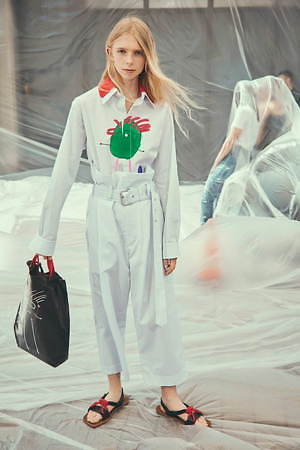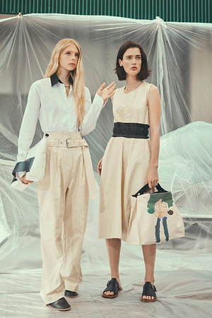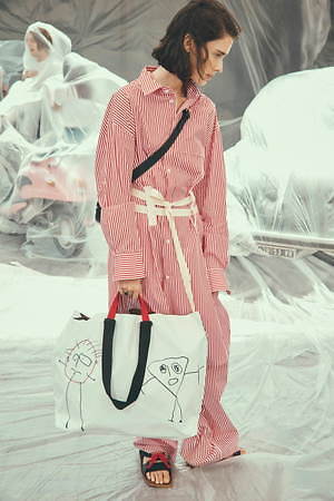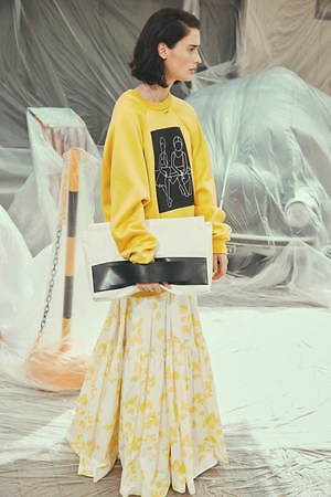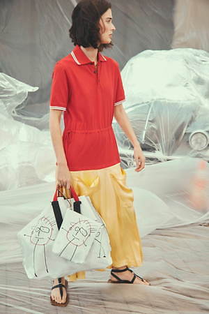 すっかりブランドを代表するモチーフとなったカロリーナの娘が描く、遊び心たっぷりの絵も、これらのウィットに富んだワードローブにあしらわれる。シャツやプルオーバーのほか、片手に持ったバッグにも登場させ、“自分の着たい服”の中でお気に入りのアイテムを増やしている。