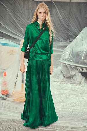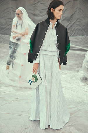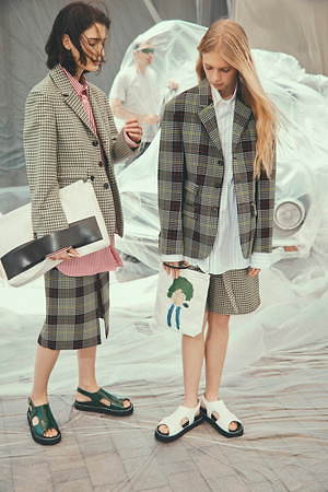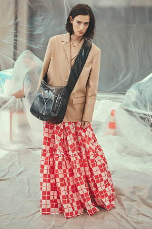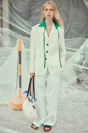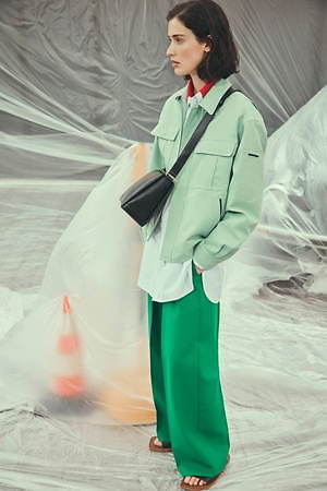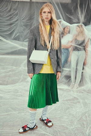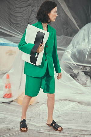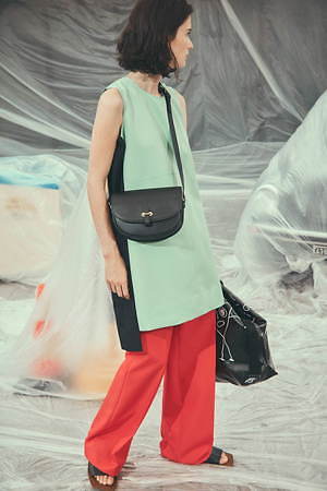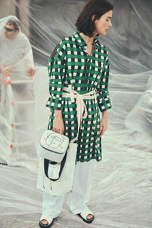 キーテキスタイルとして登場するチェック柄は、様々な表現でスタイリングに取り込んだ。フォーマルなグレンチェックのスーツから、グリーンとブルーがクロスするグラフィカルなギンガムチェックまで、クラシックにもポップにも表情を変える。そして今季のキーカラーであるジェイドグリーンの爽やかな色彩は、ボックスシルエットのマニッシュなスーツやトレンチコート、あるいはフェミニンなプリーツスカートなどで楽しんでいる。