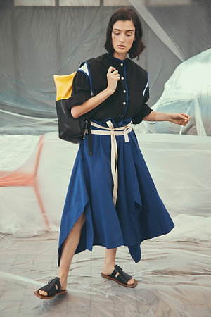 プラン シーの提案するワードローブは、デザイナーのカロリーナ・カスティリオーニ自身の“自分が着たい服”を目指している。今季は、ワークウェア、スポーツウェア、アーバンウェア、イブニングウェアといったあらゆる境界線を取っ払って、新しいジャンルのアプローチを試みた。それらは“自分の着たい服”なのだから、どんなエッジィなハイブリッドであっても、快適さを保っている。