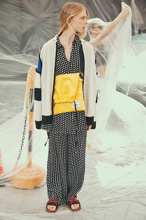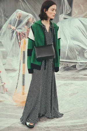 境界線のないハイブリッドな要素を言及するなら、ヴィンテージスポーツから着想を得た、ポロドレスやニットポロシャツ、カラーブロッキングのカーディガンを挙げたい。スポーティでありながら、エレガントなテクスチャーのスカートとのコンビネーションを楽しむのも今季らしい特徴だろう。また、ナイトシーンを想起させるドレスに、あえてポップなポルカドットを配しているのも面白い。