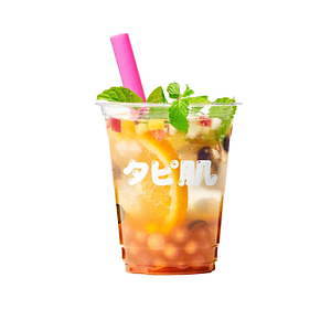 「もちもちタピ肌・ごろごろ果実の爽やかジンジャースパークリング 」には、出西生姜のオリジナルシロップを使用。そこにオレンジ、林檎、ブルーベリーなど色とりどりの果物とアールグレイをコンビネーションさせて、すっきりとした味わいに仕上げた。