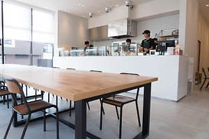 大きな窓からは自然光が入り込むため、店内は日の光で満たされた明るい空間に。白を基調としたシンプルな店内デザインとミニマルなインテリアがスタイリッシュな店舗を作り上げている。