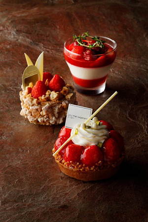 ブッフェ、アフタヌーンティーと同時にペストリーブティックでは「ストロベリーケーキフェア」を開催。真っ赤な苺が可憐な「苺のブランマンジェ」「プラリネと苺のシュクセ」「タルトフレーズ」の3種を2019年12月26日(木)から2020年3月31日(火)までの期間限定で販売する。