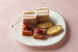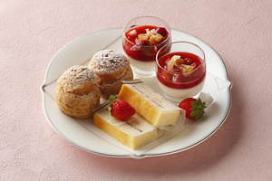 メニュー:ストロベリートライフル、タルトフレーズ、オレンジといちごのケーキ、ラズベリーマカロン、レモンとホワイトチョコレートのチーズケーキ、ヨーグルトクリームいちごソース、シュークリーム、オープンサンド、キッシュ、サンドウィッチ、プレーンスコーン、クランベリーといちごのスコーン