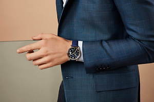 ダイヤルとベルトには深みのあるネイビーを採用してシックな雰囲気を演出。一方で、針にはイエローやオレンジの鮮やかなカラーを使い、ストラップにはブランドを象徴する「アーティストストライプ」のカラーステッチを施すなど、ポール・スミスらしい遊び心を添えている。