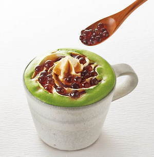 和テイストの「黒蜜きなこ抹茶ラテ」には、タピオカのトッピングがおすすめ。タピオカと黒蜜、きなこが相まって、わらび餅のような食感や風味を楽しむことができる。