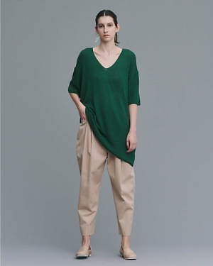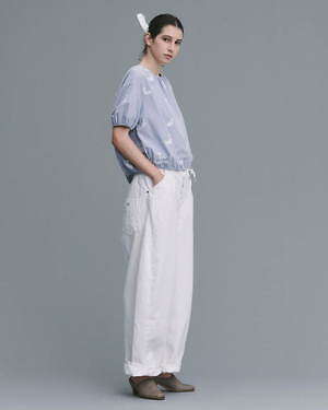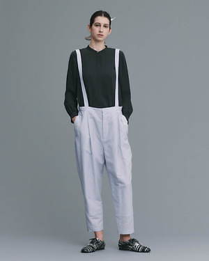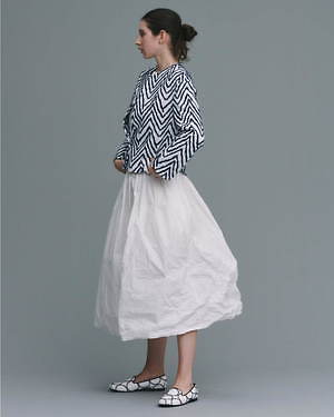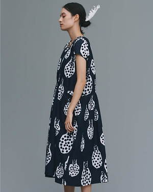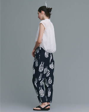 「cidre」のパンツには、ボトルの中の気泡がぶくぶくと浮遊する様子をリズミカルに描いて。ネイビーとホワイトのコントラストが、清涼感と軽やかさを演出している。「taba」のワンピースには、ゴツゴツした山椒の枝からインスピレーションを受け、ガムテープを割いた表情に映し出し描いていったテキスタイルを採用した。