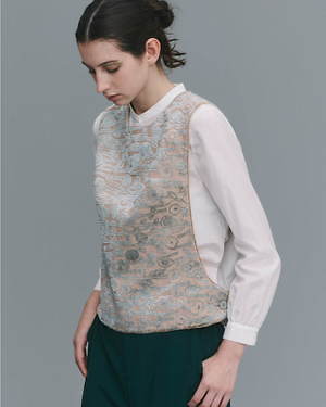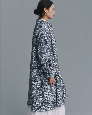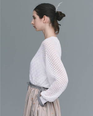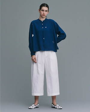 大空を飛び回る鳥たちからインスピレーションを得たのは、「kanata」のドレス。目的地を目指して羽ばたく鳥の群を、ゴム判で描いた。鳥たちが生きるのは空だけではない。「lake bird」のブラウスには、水辺に生息する鳥たちがのんびりと過ごす様子を刺繍している。